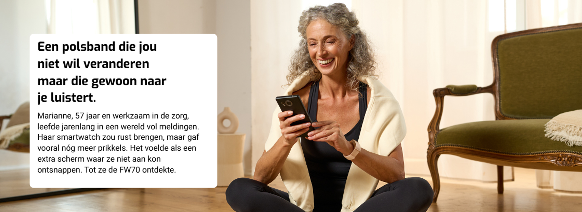 De FW70 is precies dat: een stille band die met je meeloopt, zonder schijnwerpers. Geen display, geen drukte. Gewoon een lichte polsband die registreert wat belangrijk is - je slaap, je hartslag, je stressmomenten en je beweging - terwijl jij de regie houdt.