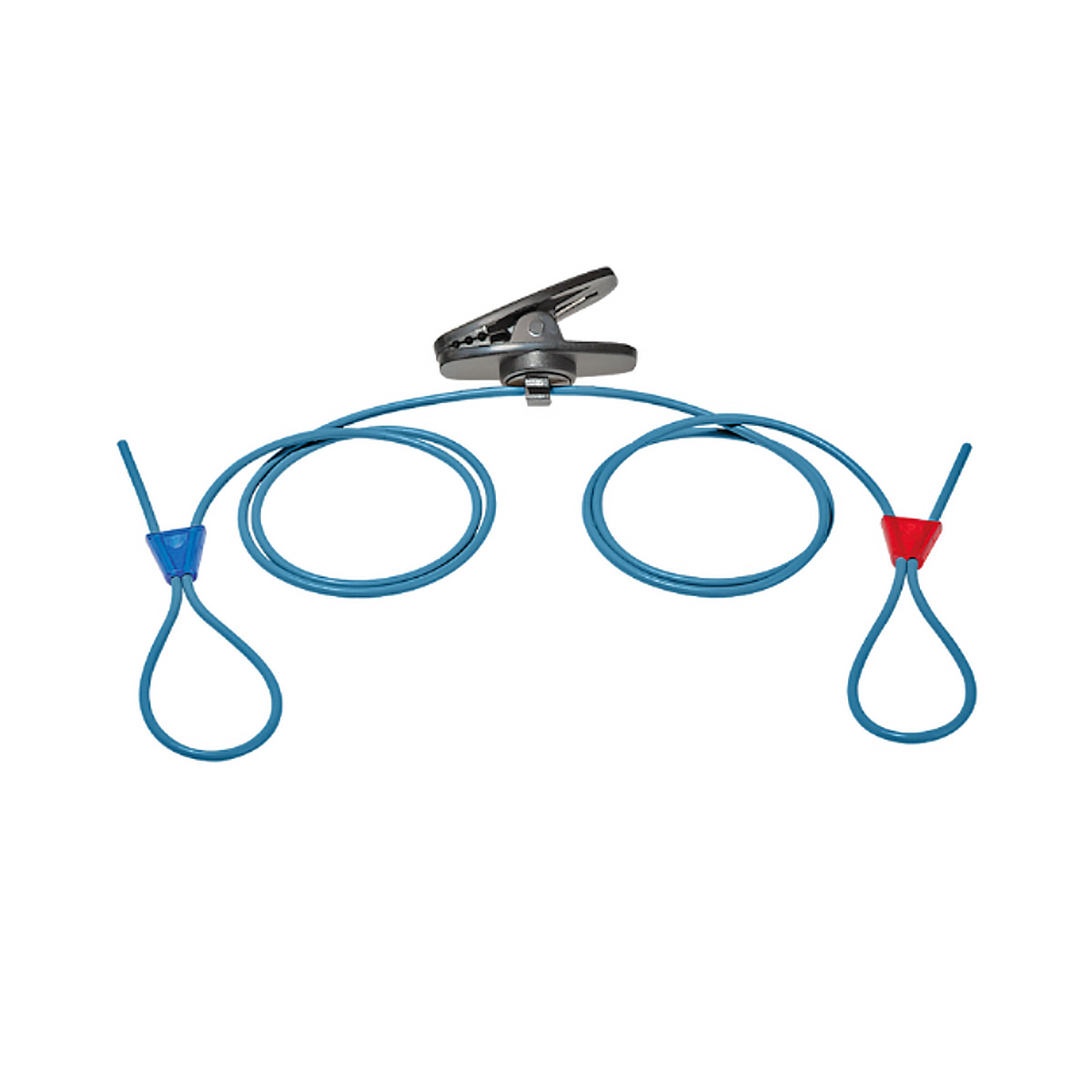 Rubberen koordset in driehoekvorm met blauwe lussen en metalen klem voor bevestiging van hoortoestellen of accessoires