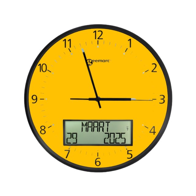 De Geemarc Viso 60 Geel is een stijlvolle wandklok die functionaliteit combineert met een elegant ontwerp. Deze klok is speciaal ontworpen voor wie een duidelijk en betrouwbaar tijdsbeeld nodig heeft – ideaal voor senioren, mensen met geheugenproblemen of slechthorenden die baat hebben bij een goed leesbare klok. Dankzij de combinatie van een analoog uurwerk en een digitaal tekstdisplay zie je in één oogopslag zowel de tijd als de dag, datum en periode van de dag.